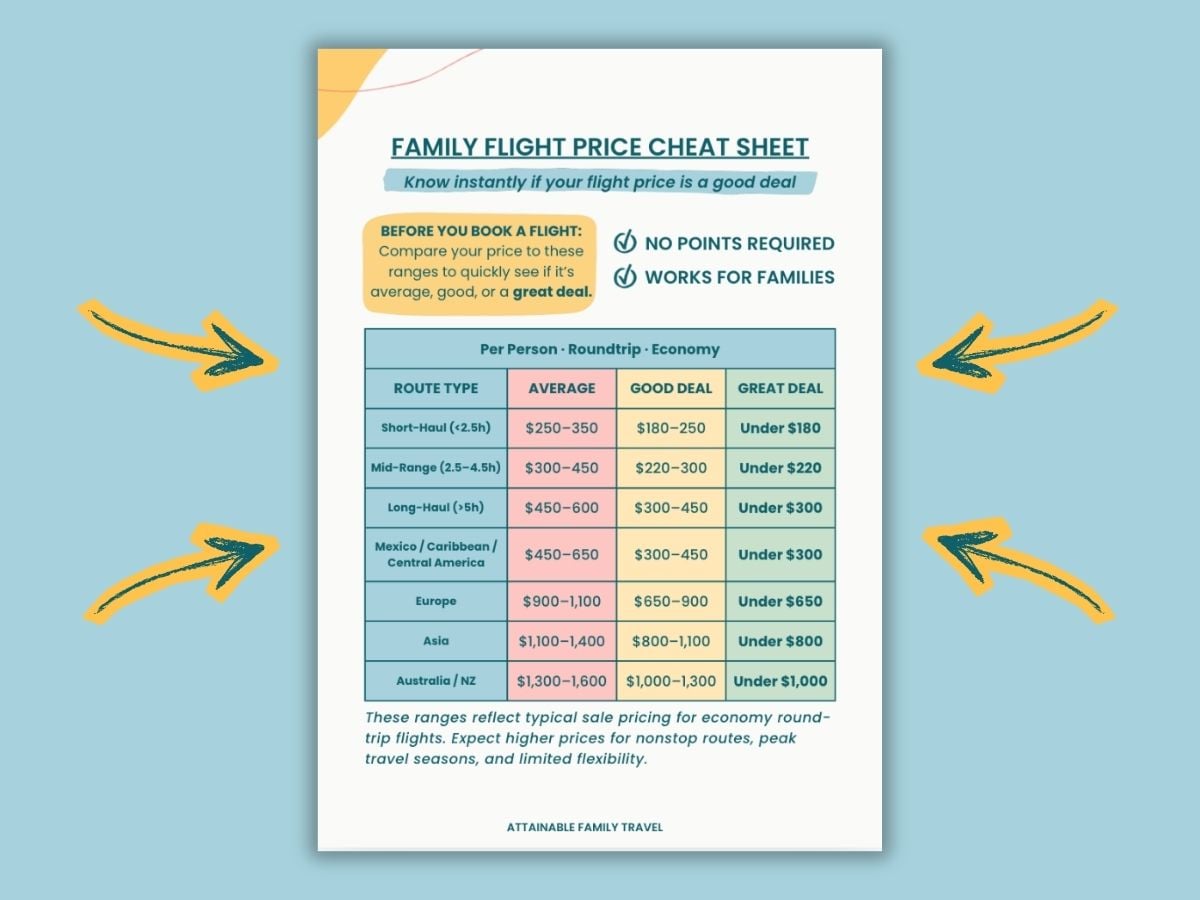 I created a simple Flight Price Benchmark Cheat Sheet that shows the typical price ranges for domestic and international flights so you can quickly tell whether a price is average, good, or a great deal.